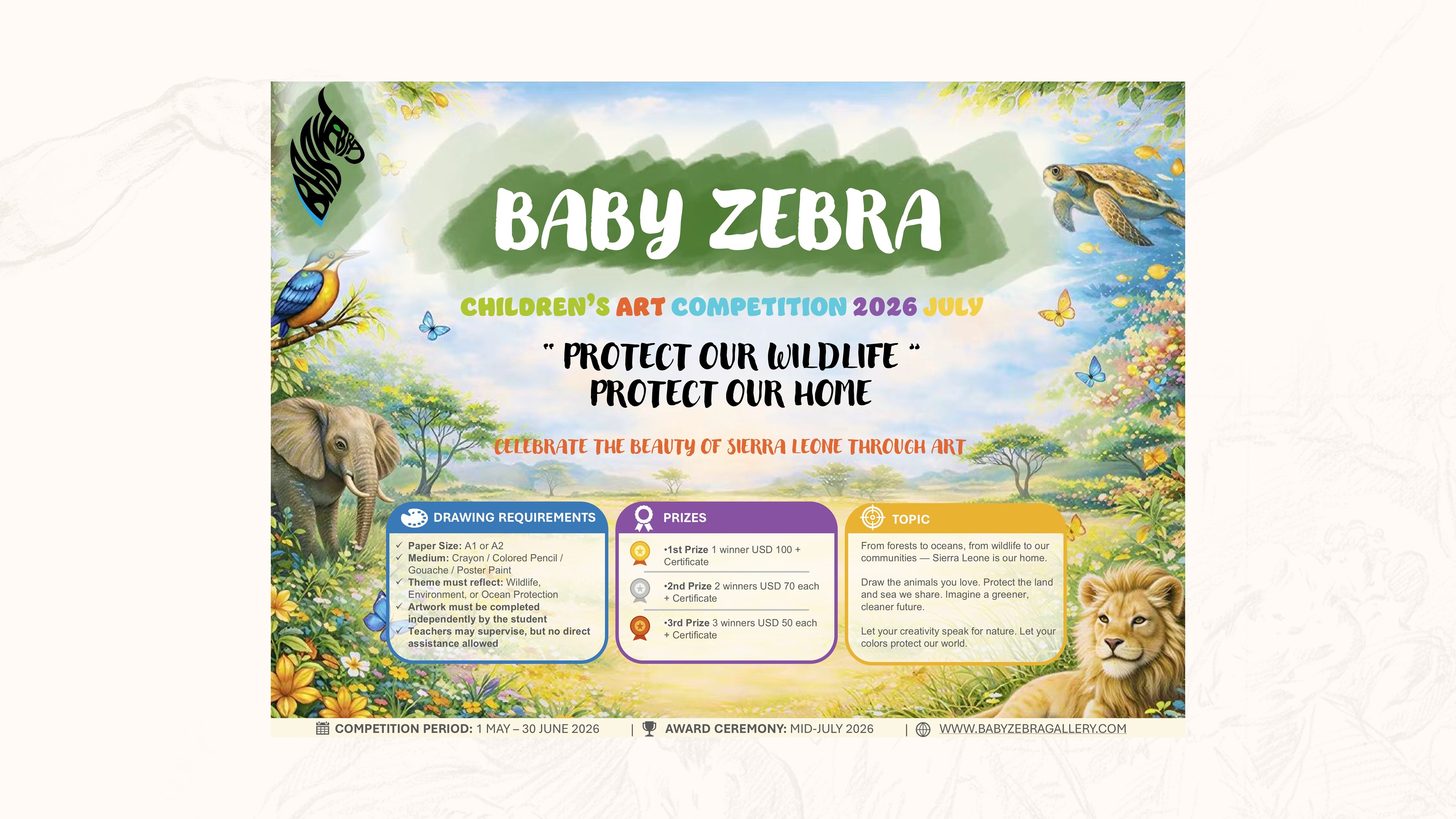 The Baby Zebra Drawing Contest is a community-focused art competition designed to inspire creativity, celebrate Sierra Leonean culture, and give young artists a platform to shine.
